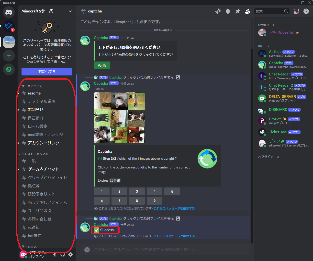 - サーバにJoinしたら、readme・一般・captchaチャンネルのみが見えており、発言できない状態です。
