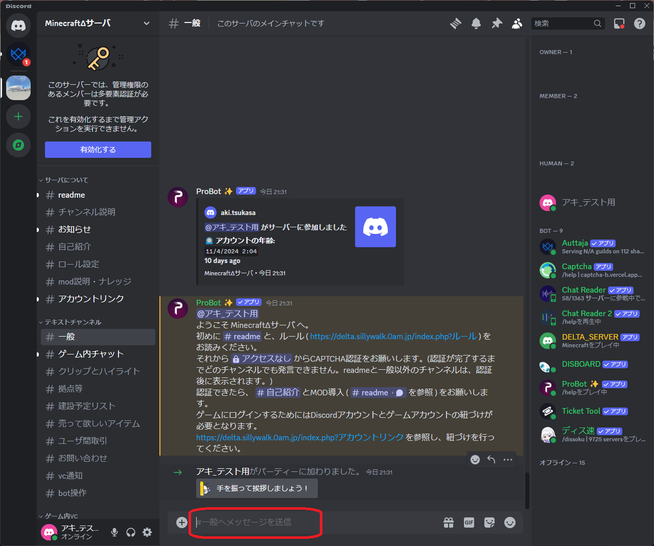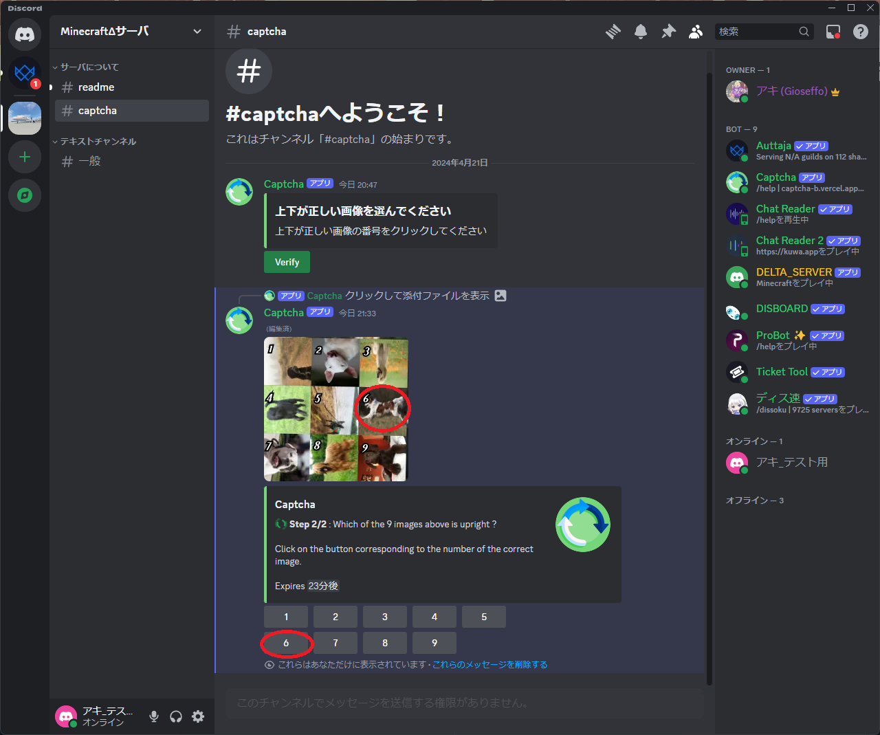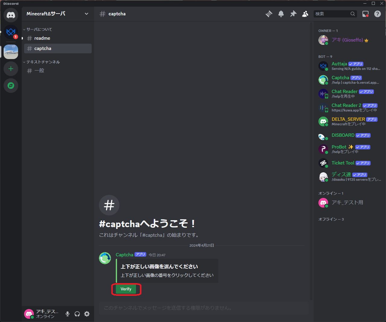 1. サーバにJoinしたら、readme・一般・captchaチャンネルのみが見えており、発言できない状態です。